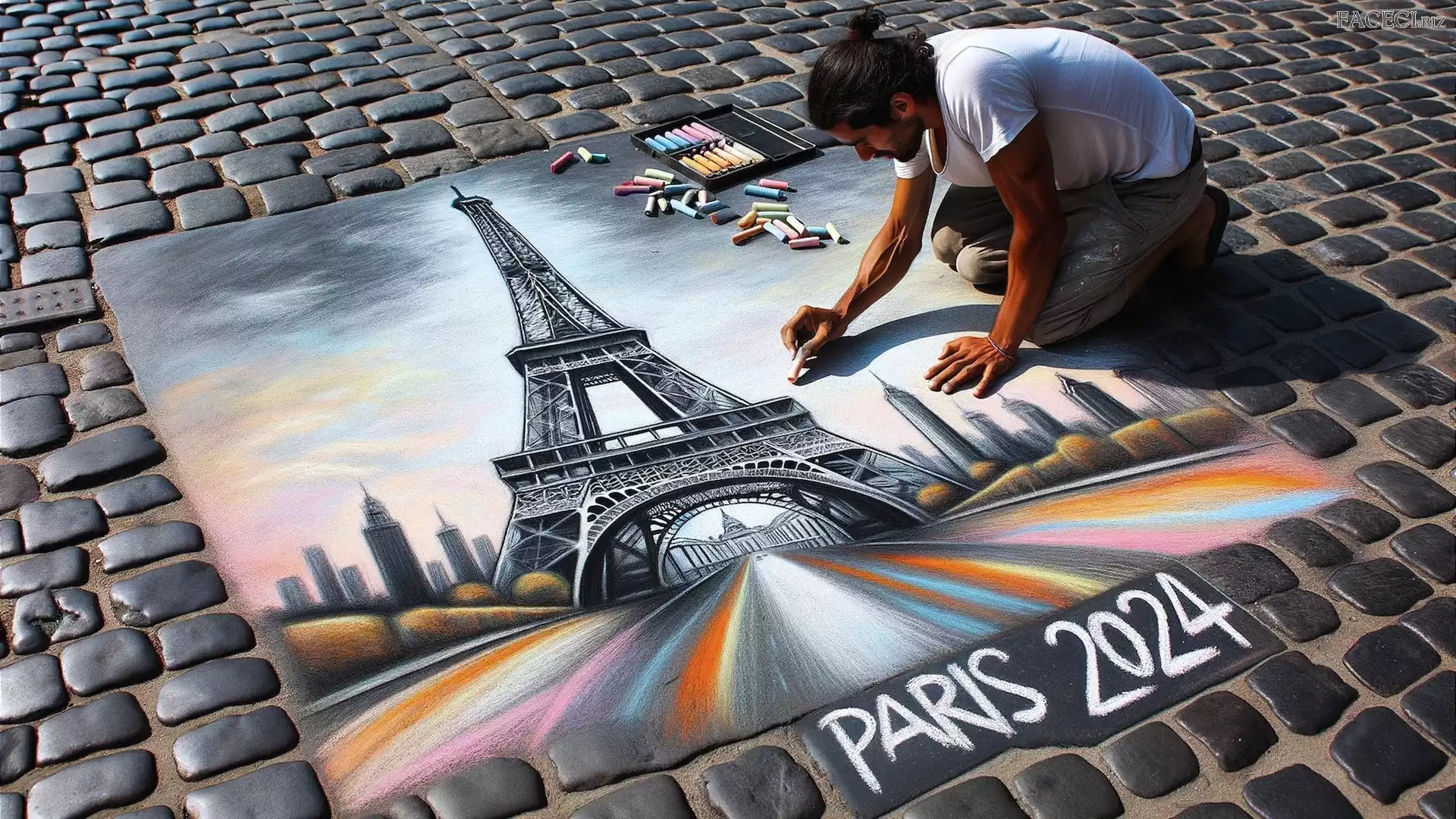 Wieża Eiffla, Grafika, Mężczyzna, Bruk, Rysunek, Ulica, Kreda - faceci.biz
